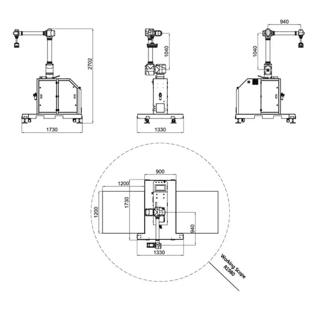 - Dimensões do equipamento: 1330 × 1730 × 2702 mm
